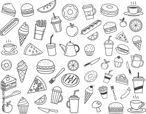 Hand Drawn Food and Drink Doodle Icon Set – Vector Illustrations of Fast Food, Snacks, Coffee, Tea, Desserts, Fruits, and Kitchen Elements for Menus, Blogs, Planners, and Creative Projects