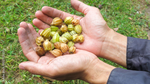 hand full of physalis fruit with husk, also known as golden berry, Cape Gooseberry, Winter cherry.