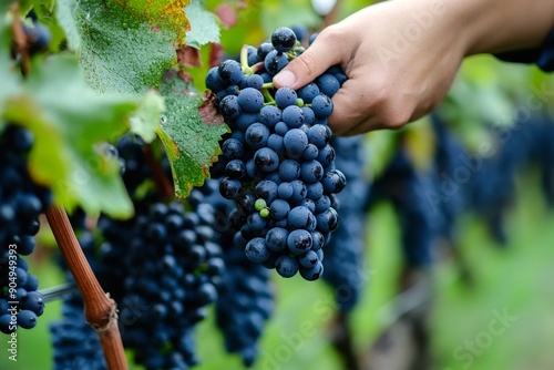 Hand Harvesting Fresh Blue Grapes in a Lush Vineyard During Autumn Afternoon