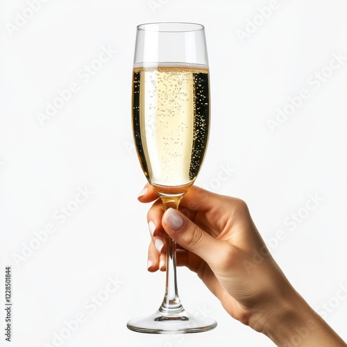 Hand holding champagne flute, bubbles, celebration, white background, toast (1)