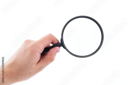 Hand holding magnifier isolated on white
