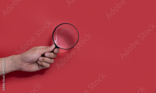 lens, magnifier, glasses, holding, business, hand, red, magnifying, search, looking, magnification, exploration, research, optical, discovery, zoom, background, detective, tool, handle, large, white, view, magnifying glass, magnify, reading, human, surveillance