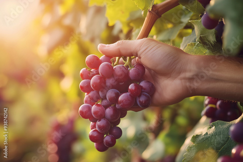 hand is holding a bunch of grapes. The grapes are purple and are hanging from a vine. Concept of freshness and abundance, as the hand is reaching out to pick the ripe fruit