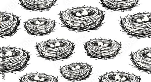 Hand-drawn artistic pattern of various sized bird nests with tiny speckled eggs nestled within each one scattered across a clean white background