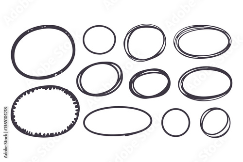 Hand-Drawn Ink Circles and Ovals Set Sketchy, Imperfect Doodle Style with Varying Sizes and Proportions, Casual Marker-Like Strokes for Artistic and Organic Designs