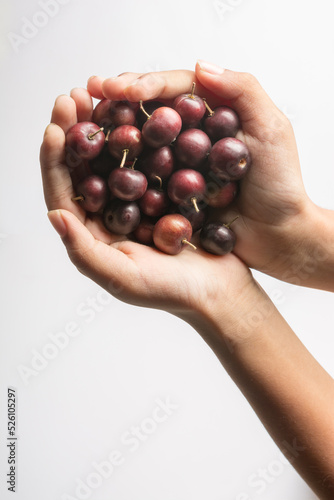 plum, madagascar, indian, fruit, handful, hand, fleshy, closeup, isolated, red, blood-red, food, edible, white, background, tropical, native, asia, africa, ayurvedic, folk, surface, medicine, purple, harvest, garden, acid, small, fresh, sweet, sour, india, sri lanka, heap, vegetarian, nutrient, medicative, herb, herbal, ripe, unripe, cut-out