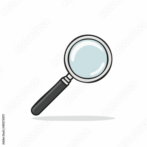 Handheld magnifying glass with a black handle and a light blue lens casting a shadow on a white background