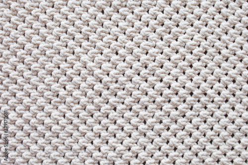 Handmade beige macrame pattern background. Macrame texture, ECO friendly, modern knitting. Macrame rug on wooden table