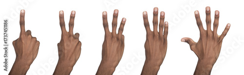 count, counting, hand, finger, 1, 2, three, 4, 5, set, isolated, white, black, man, male, person, wrist, up, raised, countdown, showing, number, mathematic, mathematic, education, digit, african, african american, skin, dark skin, nail, knuckle, gesture, sequence, back, view, dorsal, upward, body, part, learning, signs, arm, symbol, communication, teaching, calculation