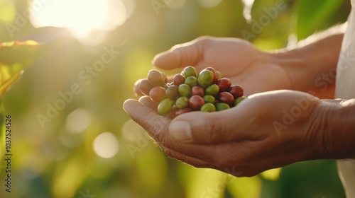 Hands gently cradle vibrant, fresh coffee beans at a plantation, capturing the essence of organic farming and the connection between humans and nature.