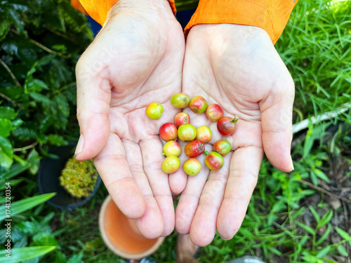 hands holding freshly harvested coffee cherries in yellow and green stages, symbolizing organic farming, agriculture, sustainability, and coffee production, handful of berries