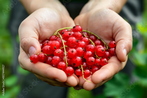 Hands holding red currants in a closeup shot, showcasing their vibrant color and freshness. Ideal for promoting organic farming, seasonal produce, and healthy eating