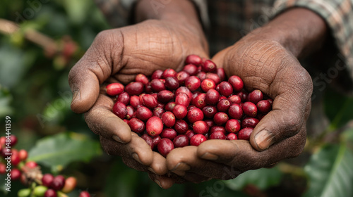 Hands of coffee grower presenting ripe red coffee beans, with plantation in soft-focus background, showcasing farm-to-cup agriculture process