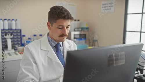 Handsome young man in lab coat intently examines data on computer screen in research laboratory.