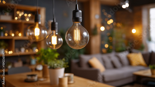 Hanging lamps with modern big bulbs inside the cozy home interior, with copy space
