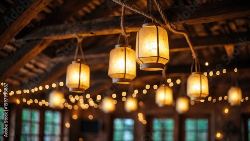 Hanging lanterns and string lights in an attic or rustic interior, with warm lighting and cozy ambiance. Interior decor and lighting concept.