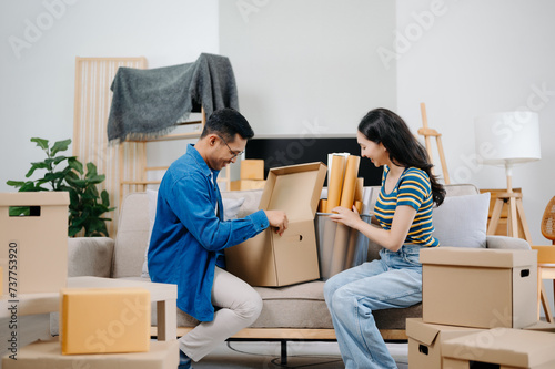 Happy asian young attractive couple man and woman with big boxes moving into a new house, new apartment for couple the new home, Moving house. .