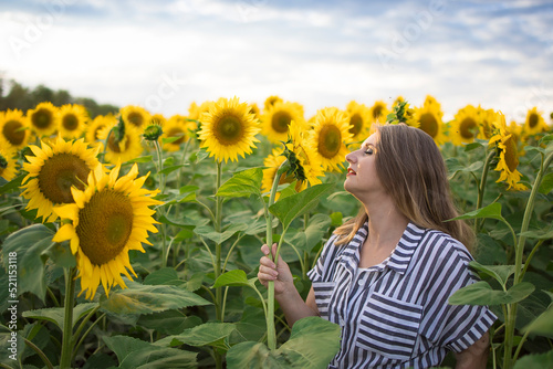 Happy beautiful middle aged woman rejoices and enjoys sunflower field blooming on a sunny day