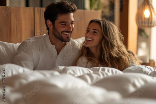 couple, bed, bedchamber, love, happy, smiling, laughing, togetherness, intimacy, romance, human relationships, relaxation, morning, comfort, home, lifestyle, man, woman, young, joy, happiness, connection, hotel, vacation, travel, weekend, get-away, leisure, well-being, pillow, blanket, duvet, white, interior, modern, cosy, light, bright, cheerful, honeymoon, home decor, real people