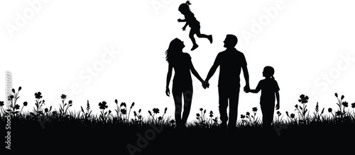 family, silhouette, children, walking, jumping, nature, happiness, bonding, parenting, togetherness, love, minimal, illustration, happy family, children playing, nature scene, family time, black-and-white