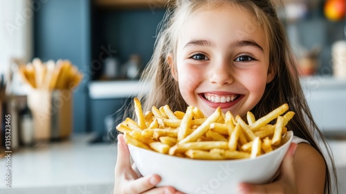 girl, fries, french fries, happy, children, food, meal, snack, delicious, tasty, smile, joy, fun, cute, adorable, children, young, eating, bowl, potato, crispy, gold, comfort food, junk food, fast food, unhealthy, healthy, nourishment, lifestyle, dinner, lunch, breakfast, eatery, home, kitchen, indoor, bright, day, portrait, closeup