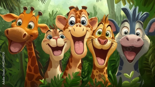 animal, jungle, happy, giraffe, playful, cute, wildlife, forest, nature, excited, adorable, cartoon, mammal, friends, portrait, group, lush, green, leaf, high-coloured, colours, bright, smiling, face, closeup, tropical, spring, summer, fun, charming, exuberant, energetic, loving, together, habitat, conservation, children, children, illustration, digital, art, outdoors
