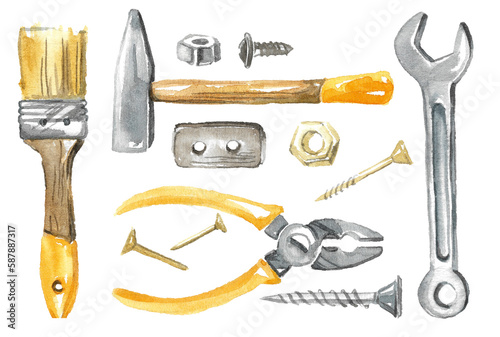Happy Labor Day. A set of industrial tools: pliers and a hammer with yellow handles, a gray wrench, screws and nuts, a paint brush. Hand drawn watercolor illustration