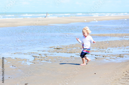 Happy little child, adorable blonde toddler girl, playing and running on the beautiful peaceful sandy beach at the North sea