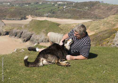 man, mature, sitting, park, grass, view, relaxed, dog, pet, border collie, sheepdog, animal, leisure time, lifestyle, one person, quiet, outdoors, happy, peaceful, nature, rural, britain, freedom, warm, summer, tranquil, smiling, love, affection