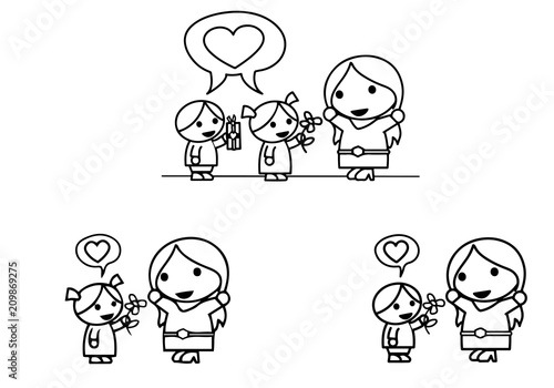 cartoon, mother, son, daughter, happy, day, love, loving, celebrate, simple, minimal, family, children, children, draw, happiness, life, doodle