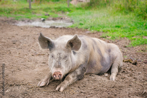 Happy, muddy boar lying peacefully outdoors on a farm.