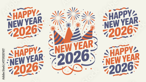 Happy New Year 2026 Illustration with Party Hats, Fireworks, and Festive Typography Elements for Celebration