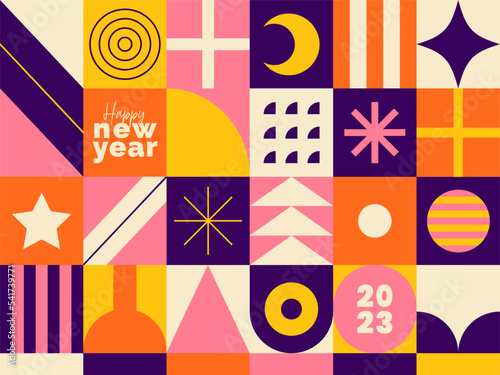 Happy new year graphic pattern. Geometric design. Abstract background. Decorative vector illustration. Winter holidays. Modern trendy patterns. Header with geometrical shapes. Bauhaus influence.