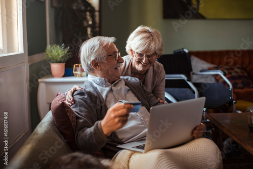 people, happy, senior, couple, shopping, online, home, laptop, credit card, caucasian, white, man, woman, male, female, indoor, adult, elderly, smiling, joyful, winter, relaxation, celebration, emotion, togetherness, activity, occupation, work, purchase, technology, modern, digital, device, cyberspace, e-business, payment, consumer, comfortable, retirement, leisure, mature, affection, human relationships, healthy, equity, inclusion, diversity, 2, lifestyle