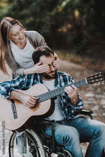 fun, happy, cheerful, young, caucasian, smiling, leisure, people, beautiful, adult, summer, lifestyle, outdoors, love, together, casual attire, attractive, girl, couple, enjoyment, pretty, human relationships, woman, man, romantic, smile, togetherness, romance, photogenic, male, joy, wheelchair, female, weekend, summer, boyfriend, girlfriend, disabled, handicap, park, guitar, acoustic, instrument, playing, concept, eye, hand, imagining, collage