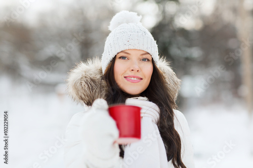 winter, happy, woman, cup, tea, drinking, mug, face, outdoors, nature, smiling, cheerful, young, holding, walk, leisure, holiday, people, person, blank, empty, copy space, copy, space, advertisement, advert, advertisement, advertising, drink, beverage, hot, female, girl, healthy, warming, lifestyle