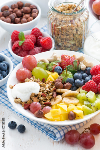 healthy breakfast - berries, fresh fruit and cereal on the plate