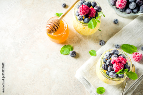 Healthy diet good ideas, sweet breakfast polenta in portioned jars with fresh frozen berries and honey, beige stone background copy space top view