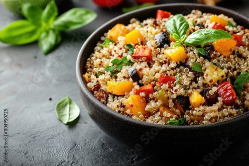Healthy quinoa bowl roasted veggies and food photography