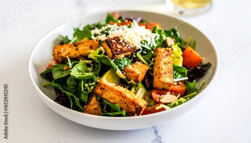 salad, tofu, greener, vegetable, almond, cheese, healthy, delicious, fresh, lunch, dinner, protein, cookery, vegetarian, vegan, tasty, food, plate, dish, closeup, light, colourful, appetising, crispy, toasted, pale, white, marbled, surface, background, studio, lighting, nourishing, meal, eatery, balanced, ingredient, salad bowl, parmesan, natural