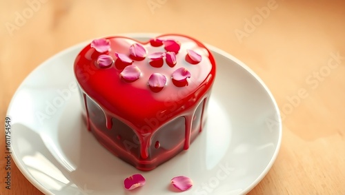 Heart-shaped jello dessert with rose petals on plate, minimal pastel close-up, high-quality photo