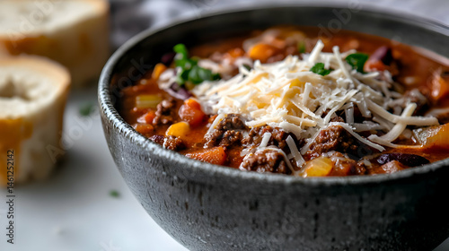 chili, soup, food, bowl, dinner, lunch, meal, beef, tomatoes, vegetable, bean, meat, brown, red, orange, grey, delicious, tasty, homemade, healthy, closeup, dish, rustic, porcelain, ceramic, cookery, ingredient, serving, spoon, plate, bread, side dish, eatery, kitchen, comfort food, closeup