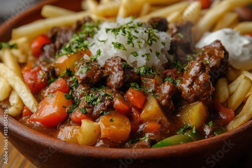 beef stew, potato, carrot, rice, french fries, hearty, stew, savoury, delicious, food, meal, dinner, lunch, cookery, comfort food, home cooking, brown, orange, green, parsley, herb, vegetable, meat, protein, rich, creamy, bowl, wooden bowl, closeup, food photography, appetising, tasty, warm