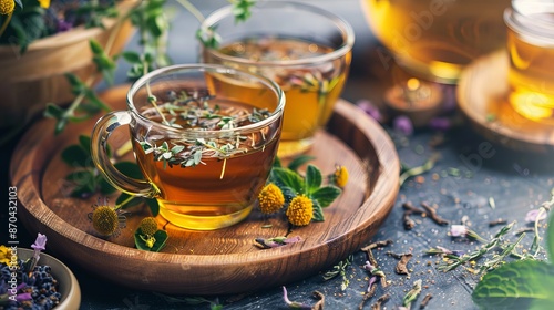 "Herbal tea served on a wooden tray."