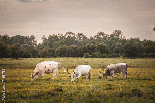 Herd of Podolian cows grazing free range on the pastures in Serbia, Vojvodina with a grey cow with long hors staring. Podolian cattle is a breed of cows and beefs from Europe with long horns.