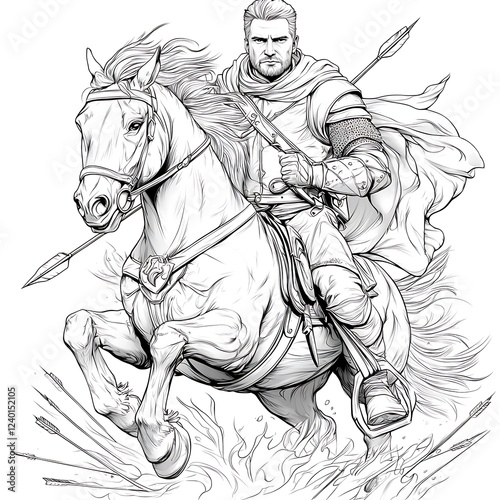 hero, horse, action, colouring, design, historical, adventure, warrior, vignetting, movement, fantasy, brave, illustration, anatomy, gallop, character, artistry, concept, detailed, dynamic, mythical, tale, journey, dramatic, scene, powerful, equestrian, mediaeval, strength, heroism, epic, engagement, story, outline, imagination, creative, expressive, visual, posing, legend, equine