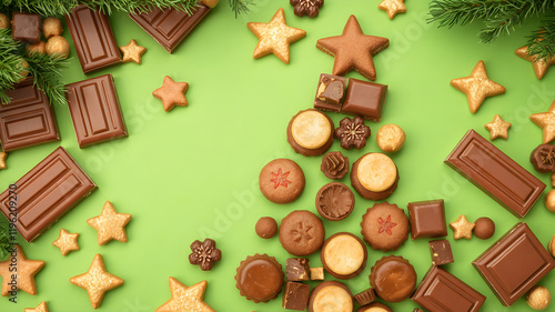 High angle shot of a Christmas tree shape crafted with chocolate bars and cookies on a bright green background with golden stars, HD, 8K
