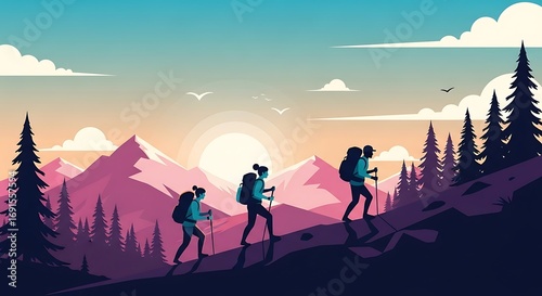 hiker, mountain, sunrise, landscape, adventure, nature, travel, trekking, climbing, people, illustration, vector, silhouette, mountain, peak, sky, cloud, tree, forest, vibrant, colours, pink, sunset, calm, peaceful, inspiring, activity, journey, exploration, graphic, design, art, minimalist, stylised, serene, vacation, tour tourism, expedition, scenic, colourful, motivational