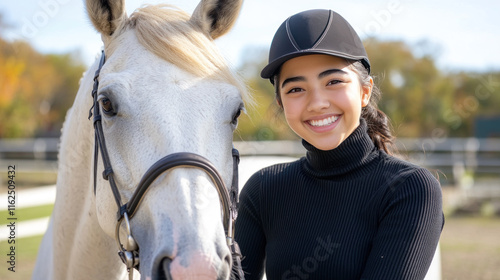 Hispanic woman in black turtlenecks and equestrian attire with white horse