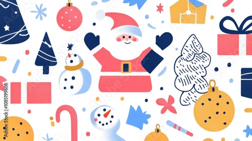 Holiday-themed illustration pack with Santa, snowman, baubles, and ribbons, perfect for festive decor.